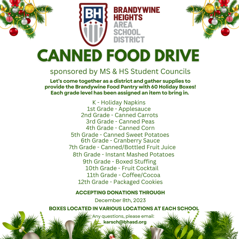 Let’s come together as BHASD and gather supplies to donate 60 Holiday Boxes to the Brandywine Food Pantry. Each grade level is responsible for a specific item in the boxes. If you can donate, please send in the items with your child, there will be boxes located in various locations at each school. Collection is happening until 12/8/23!
